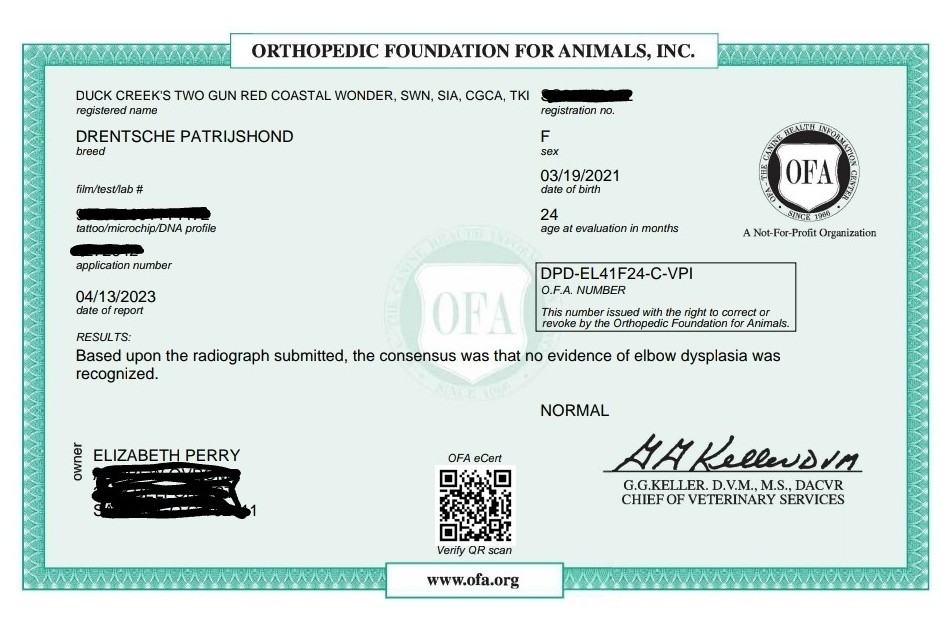 The Orthopedic Foundation for Animals is a third-party non-profit organization that evaluates x-rays for evidence of joint dysplasia. For Drents, it’s recommended that both Hips and Elbows are evaluated.