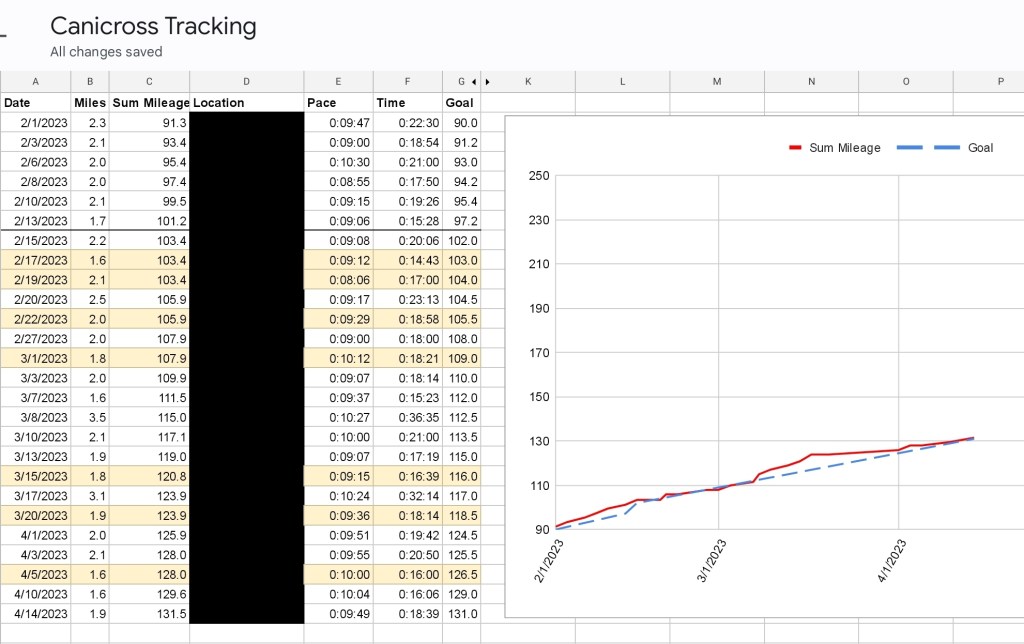 The result is my “Canicross Tracker” spreadsheet – I use google sheets since I can access it across all my devices (phone, tablet, work laptop, etc). The locations are blacked out for privacy – and yes, I know, I’m not a very fast (or far) runner, but with Iris at least I have fun!