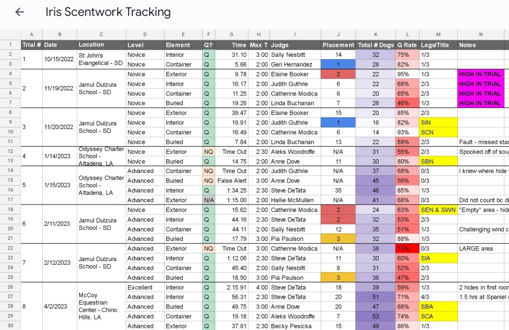 As Iris hit the ground running in her scentwork career, it quickly became difficult for me to remember all of her results, the judges she showed under, her placements, etc. So the second spreadsheet contains all the information I can gather from her scentwork trials.