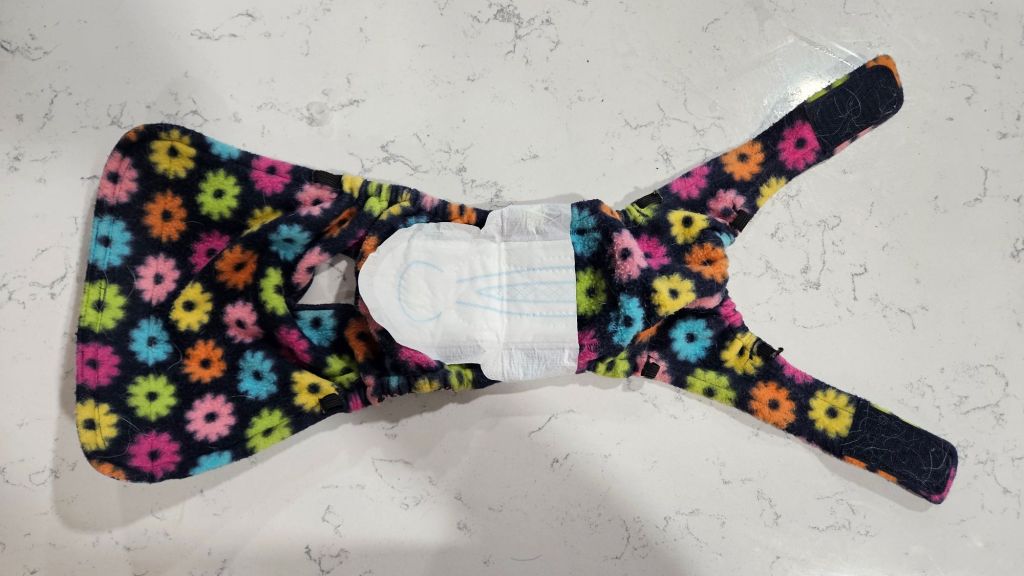 - Cloth diapers + pads. I recommend keeping two or three washable dog panties sized for your girl on hand. Inside the diaper, I use disposable women’s pads or pantyliners, depending on the flow. I change out the pad every few hours, or whenever I remove the diaper. If the pad is fully saturated, I adjust the thickness or frequency of changes. Remember, the goal is to keep her as clean and dry as possible! See below for an image of this setup.