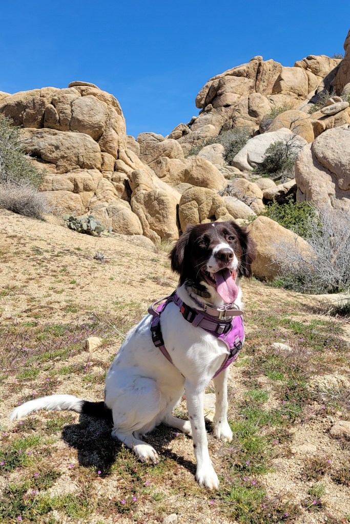 Canicross is the sport of trail running powered by a dog, where the dog and human each wear specialized harnesses and are attached by a bungee line so the dog can run out front and pull their handler. Iris typically runs canicross 2-3 times a week, which keeps both of us in shape! Most of the rest of the days each week Iris runs “non-canicross” either on or off leash. While our average runs are between 1.5-3 miles, she has run upwards of 4 miles canicross and 6 miles non-canicross, limited only by her handlers’ fitness.