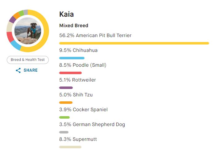 Kaia was adopted from Labs & More, a San Diego dog rescue who pulled her from a local shelter in Apple Valley, CA, who found her as a pregnant stray. Kaia had 13(!!) puppies – all of whom were also adopted out.